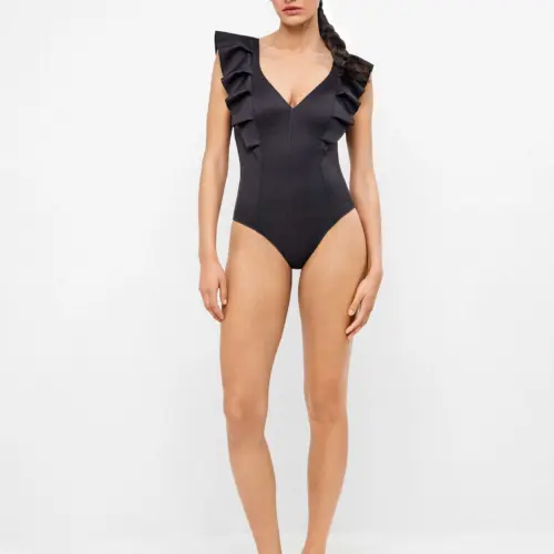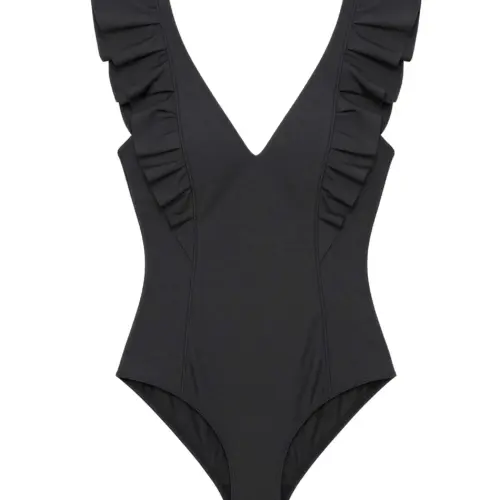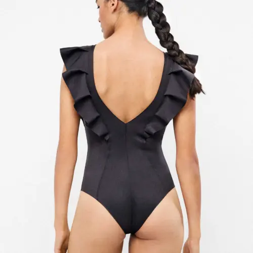 Bañador tejido high tech efecto envolvente. Sin copa ni aros, para mayor comodidad. Detalle de volantes en escote delantero y trasero que aporta movimiento natural. Líneas transversales en el cuerpo que estilizan la figura.