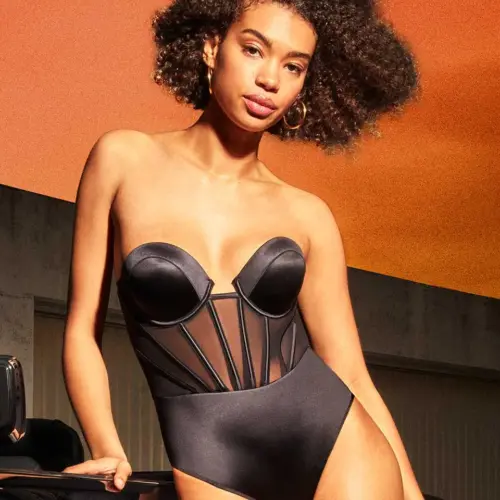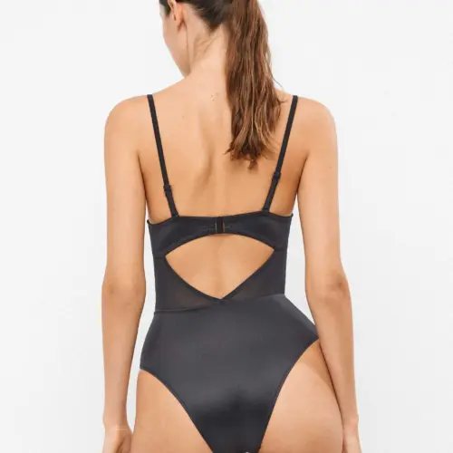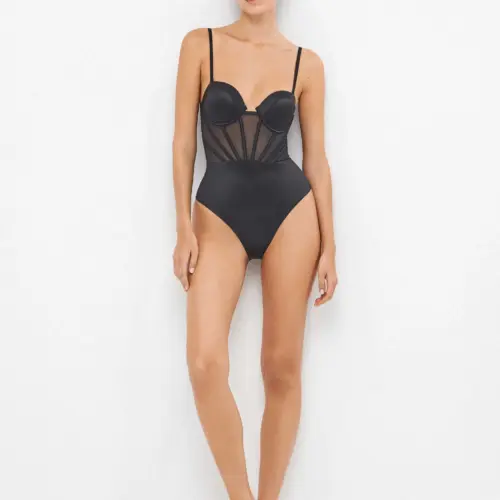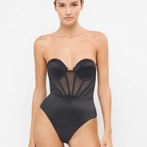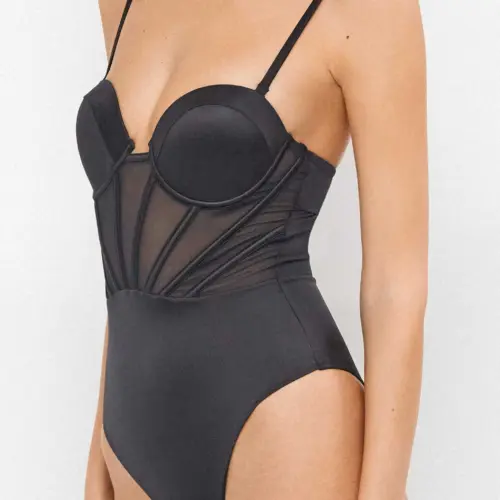Bañador tipo corsé de escote bandeau. Con aros, copa fija y tirantes desmontables. La zona abdominal de tul negro y ballenas, con corte en cintura. La espalda en pico con broche de cierre y smaller back. Confeccionado en tejido de microfibra satinado, ideal para cualquier evento por su versatilidad.