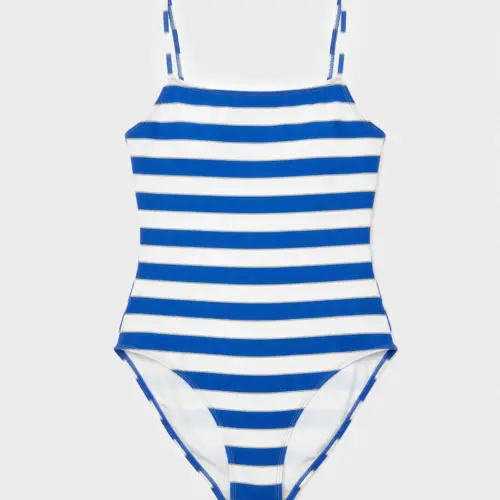 Bañador sin aro y con copas de foam extraíbles, diseñado para ofrecer una sujeción cómoda y adaptable. Confeccionado en tejido estampado de rayas tejidas que aporta un look alegre y vibrante ideal para los días de sol. Perfecto para combinar estilo y confort en la playa o la piscina