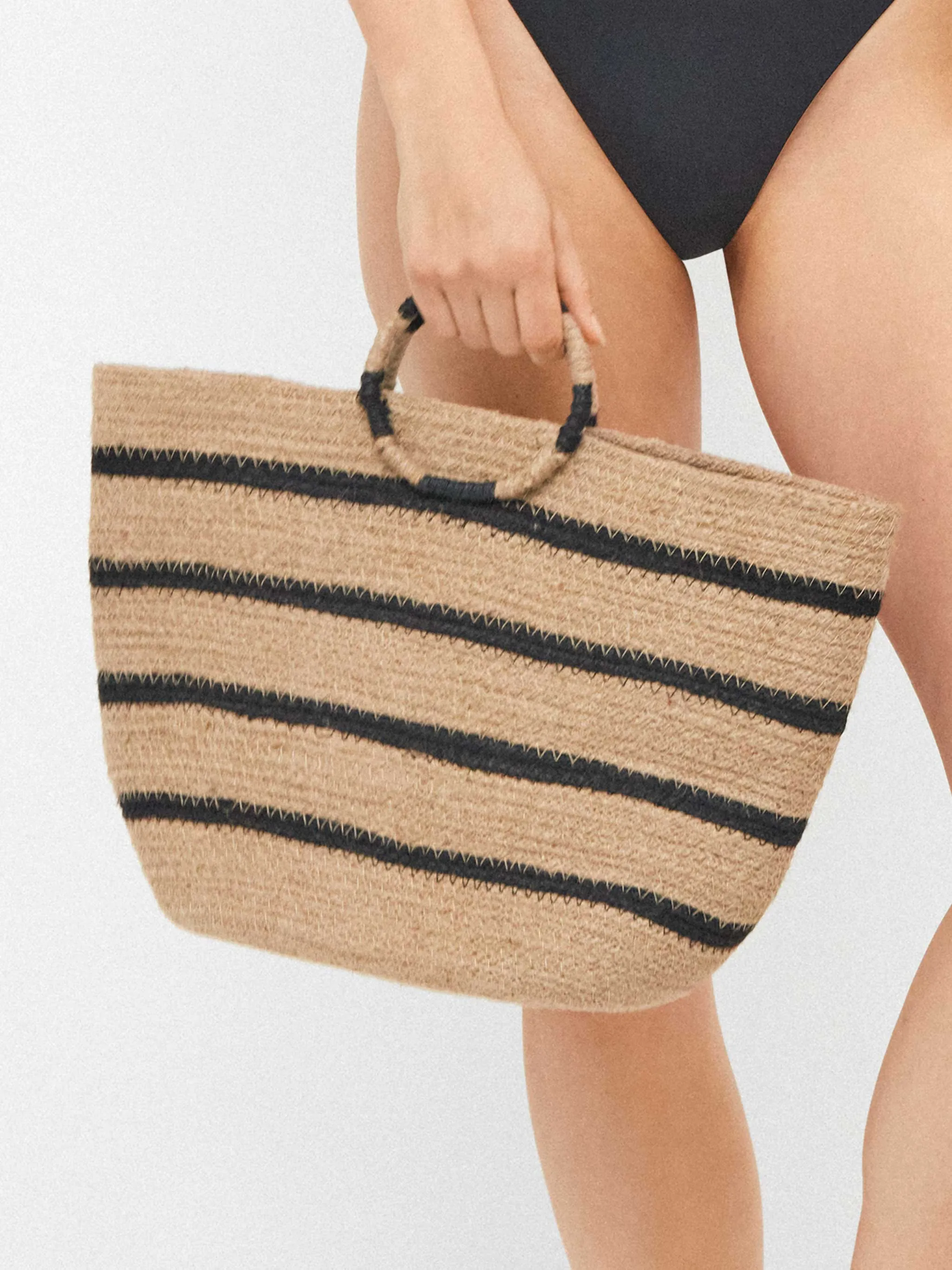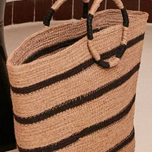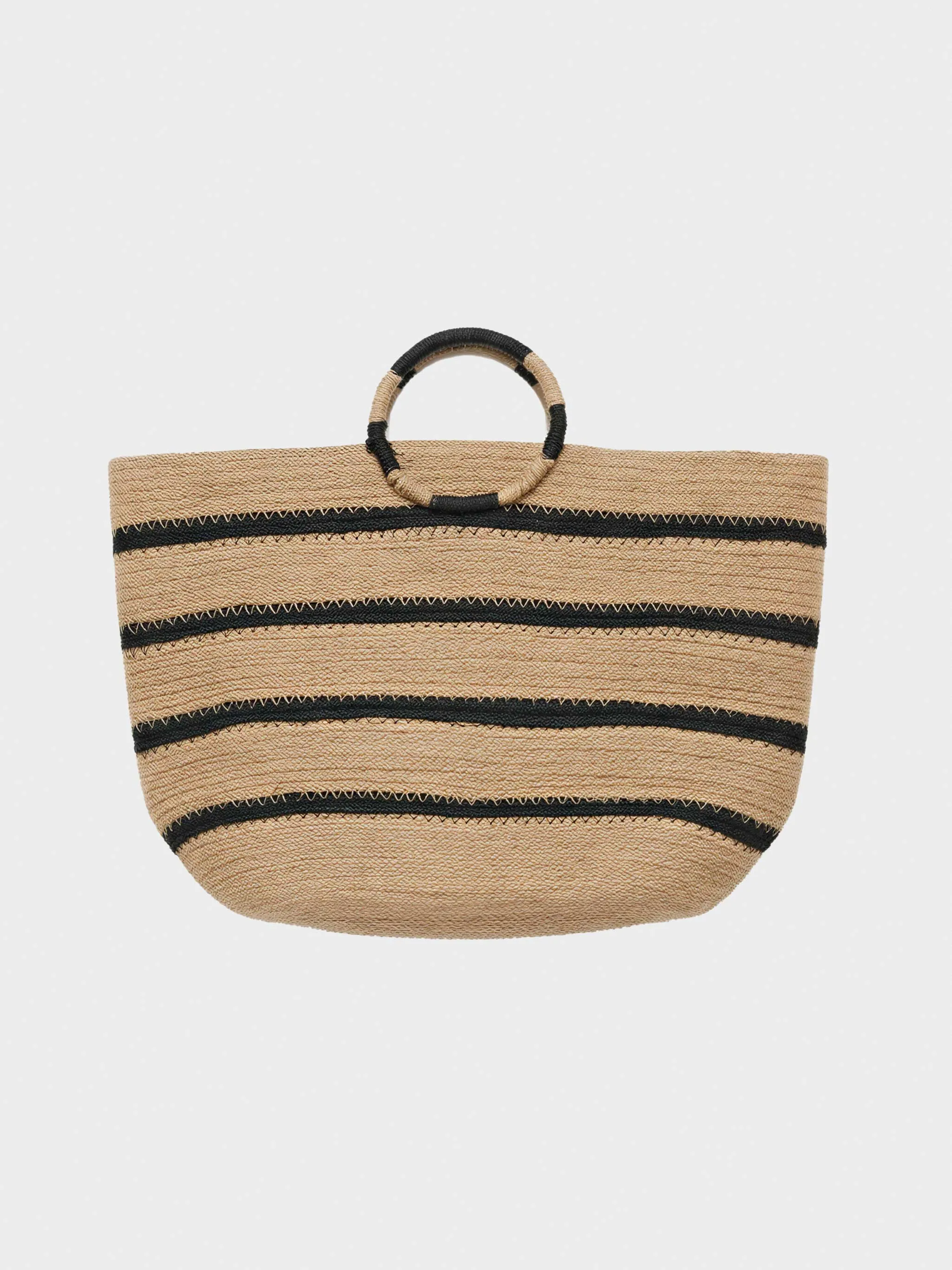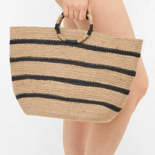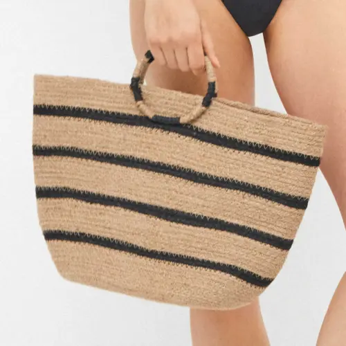 Bolso tipo capazo de fibras de yute en color natural y líneas en negro. Asas en forma circular combinadas con negro. Ideal para darle un toque especial a tu look más veraniego.