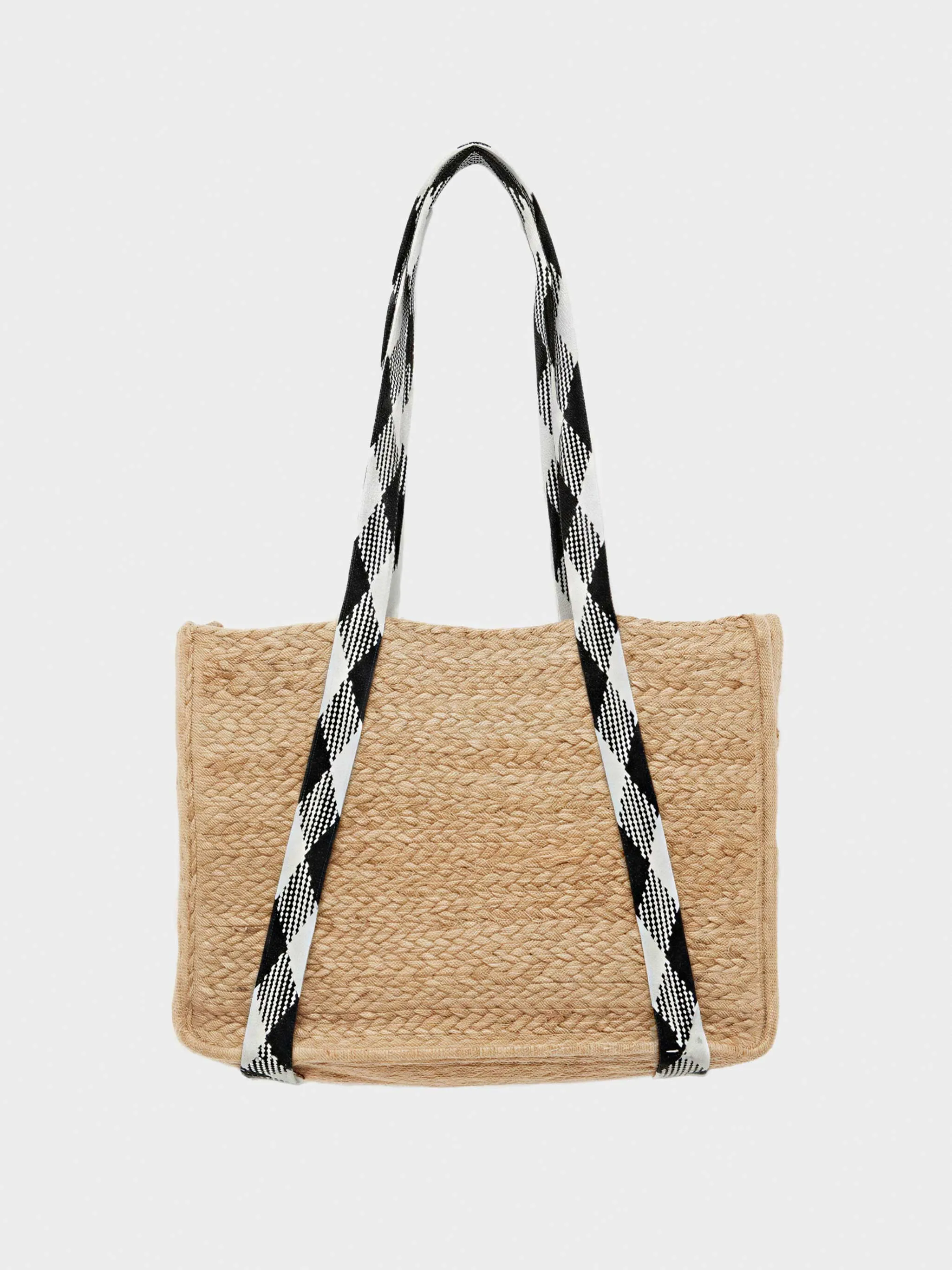 Bolso de rafia trenzado y de capacidad media, con asas de cintas y estampado bicolor. Compuesto por fibras naturales de yute. Ideal para tus looks más veraniegos.