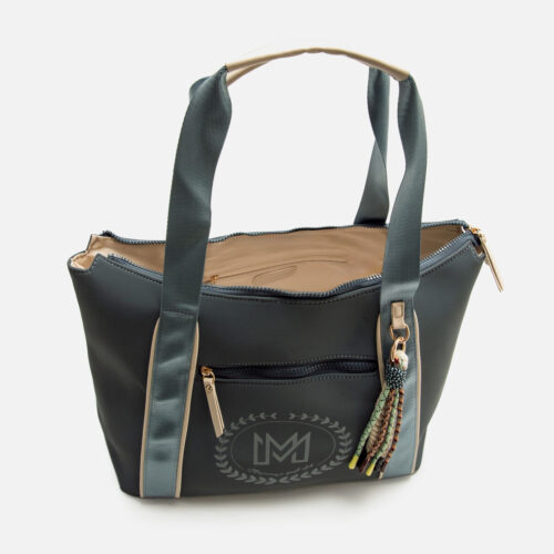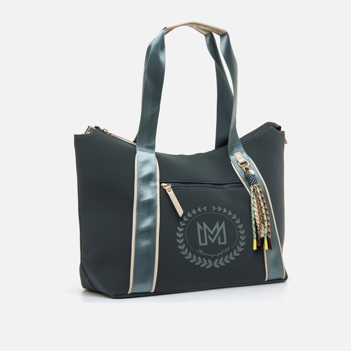 Bolsos shopper para mujer, modelo Lodos de Mariamare. Su diseño amplio con asas largas de tejido permite llevarlo cómodamente al hombro, ofreciendo espacio para transportar tus básicos con facilidad. Incluye cierre superior de cremallera con forma de medialuna, y bolsillo frontal con cremallera decorado con el logo de la marca. Destaca el detalle de borlas multicolor colgantes que aporta un toque distintivo al diseño. El interior dispone de forro liso con bolsillo que facilita la organización.