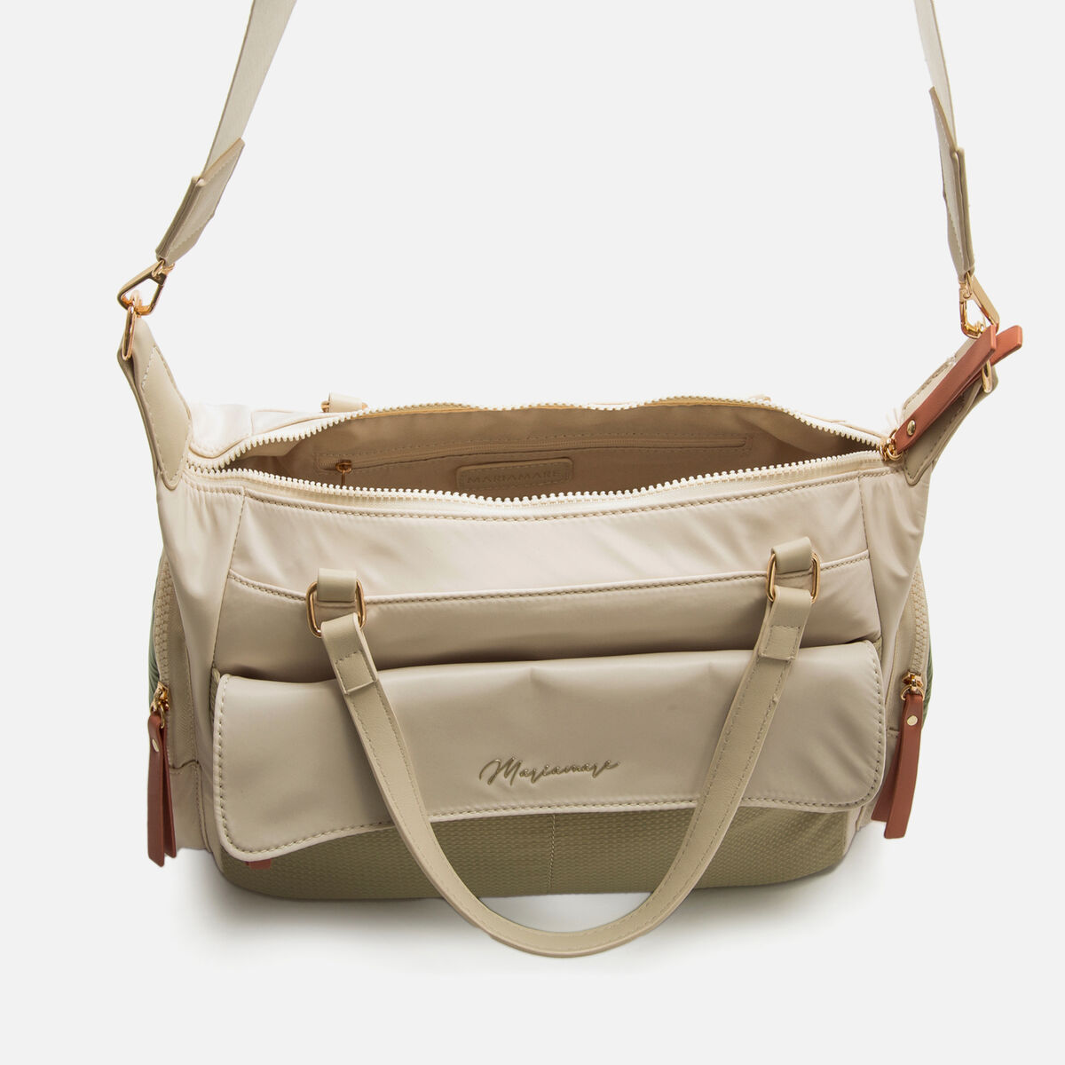 Bolsos tipo bowling para mujer, modelo Miras de la marca Mariamare. Ideal para quienes necesitan espacio y organización, incluye doble asa de mano y correa ajustable para llevar al hombro o cruzado. Su interior amplio con cierre de cremallera y varios compartimentos permite guardar todo lo necesario, mientras que los bolsillos laterales y el frontal con solapa ofrecen acceso rápido a objetos pequeños. Un diseño con efecto acolchado metalizado que se adapta tanto a la rutina diaria como a escapadas de fin de semana.