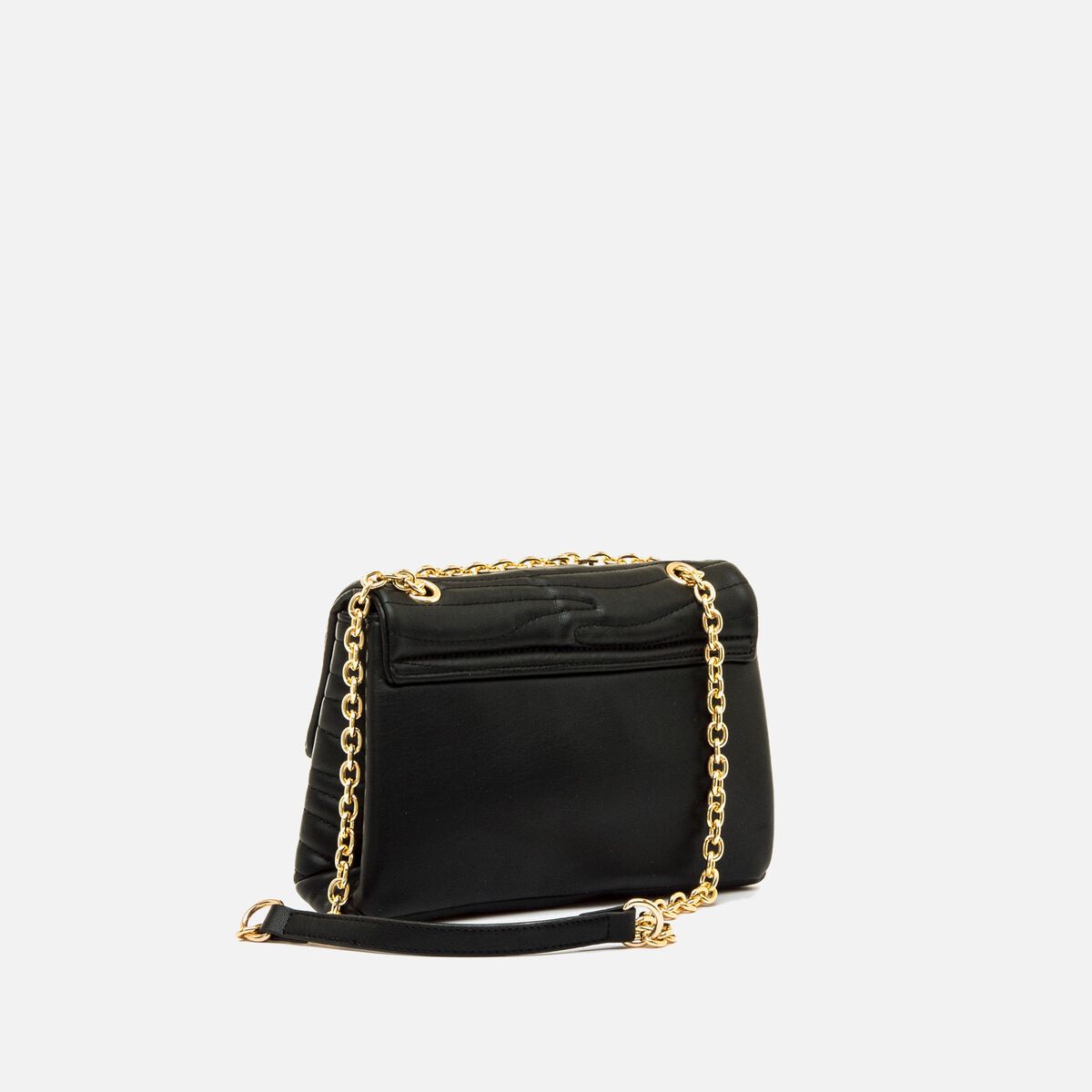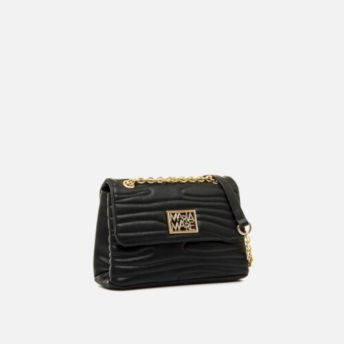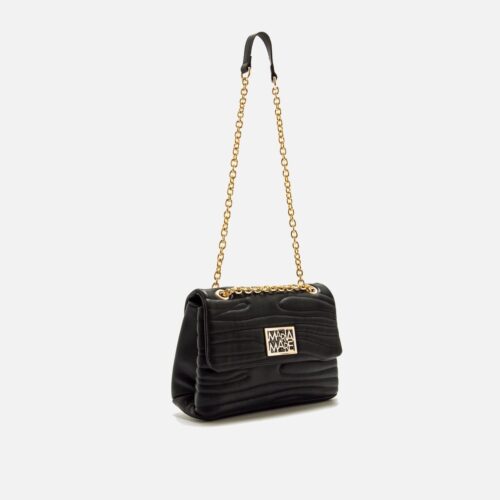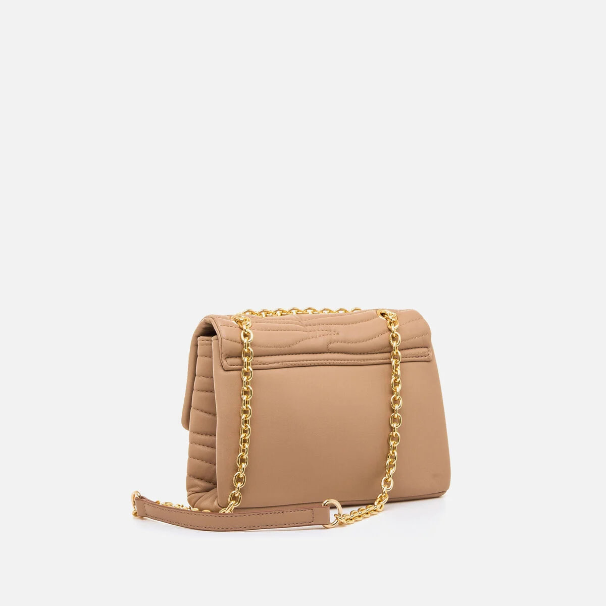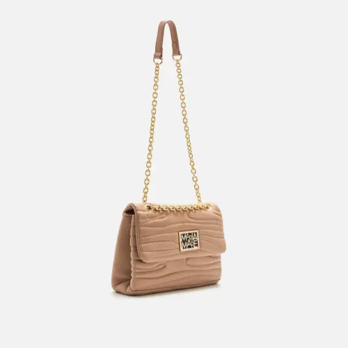 Bolso de color nude para mujer de Mariamare, modelo Shana estilo bandolera con diseño acolchado y solapa. Presenta costuras onduladas sobre toda la superficie y logo metálico cuadrado en el frontal que aporta un detalle llamativo. Incorpora cadena dorada con refuerzo en la parte superior para mayor comodidad al llevarlo al hombro. El cierre magnético bajo la solapa y el interior forrado con bolsillo organizador lo hacen práctico y funcional. Un modelo versátil con un toque actual que se adapta a diferentes estilos.