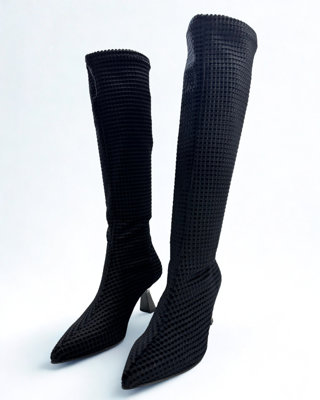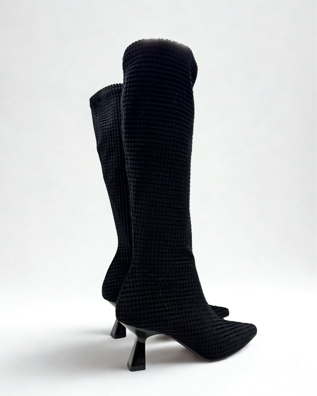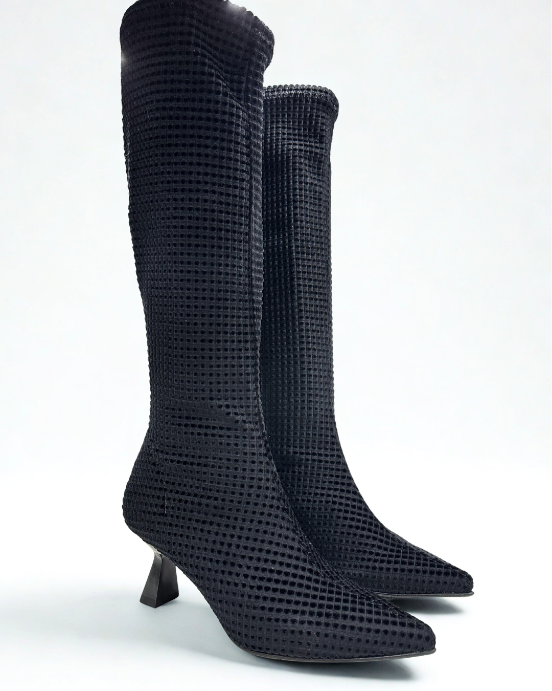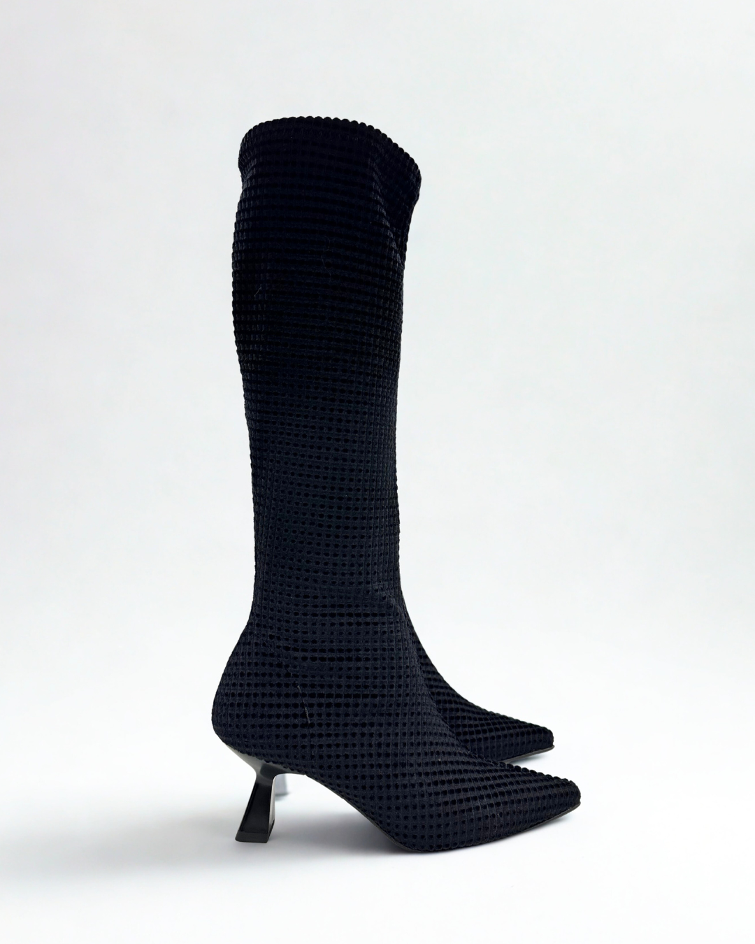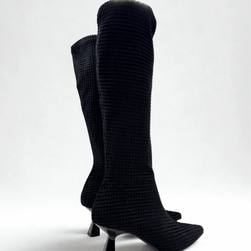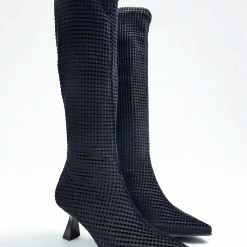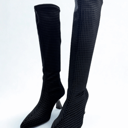 Bota de color negro con un dibujo aterciopelado con un tacón de chupete.