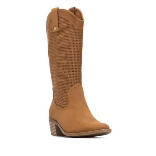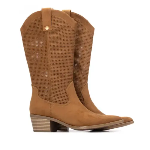 Bota de mujer de la marca Xti, fabricada en suave material de antelina, perfecta para los días de entretiempo o verano. Presenta un bonito diseño de inspiración cowboy, con detalles de troquelado que no solo aportan estilo, sino que también permiten una mejor transpiración, haciendo de esta bota una opción fresca y ligera. Su tacón bajo de 5 cm proporciona comodidad y estabilidad, ideal para combinar con vestidos o looks casuales de temporada. Una opción versátil y con mucho estilo para tus outfits de primavera y verano. Este modelo ha obtenido el certificado vegano por la organización mundial PETA (Organización de los derechos de los animales).