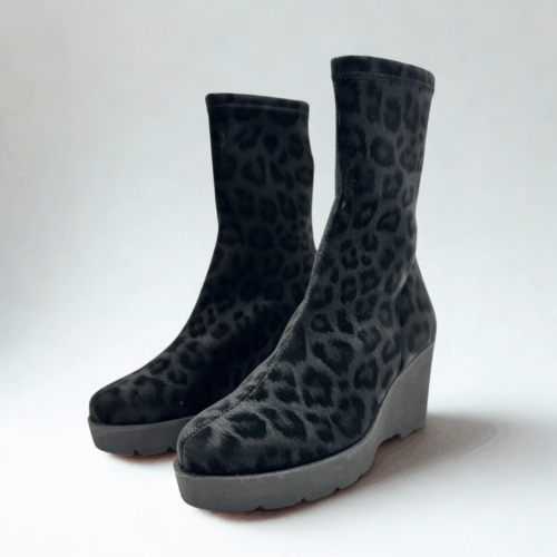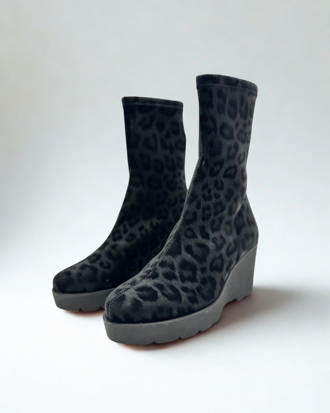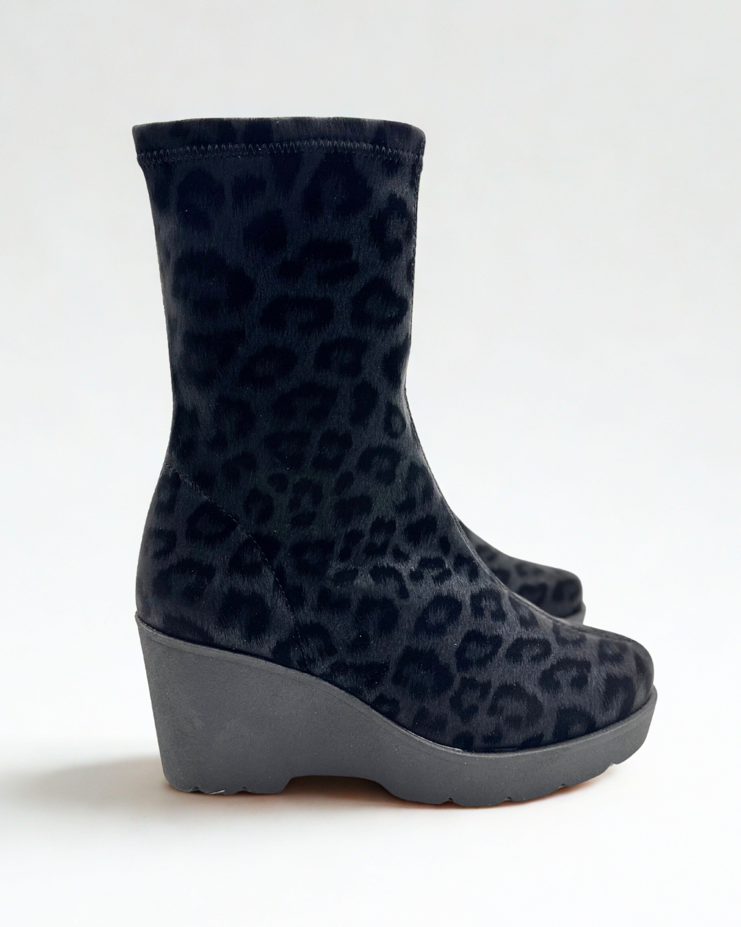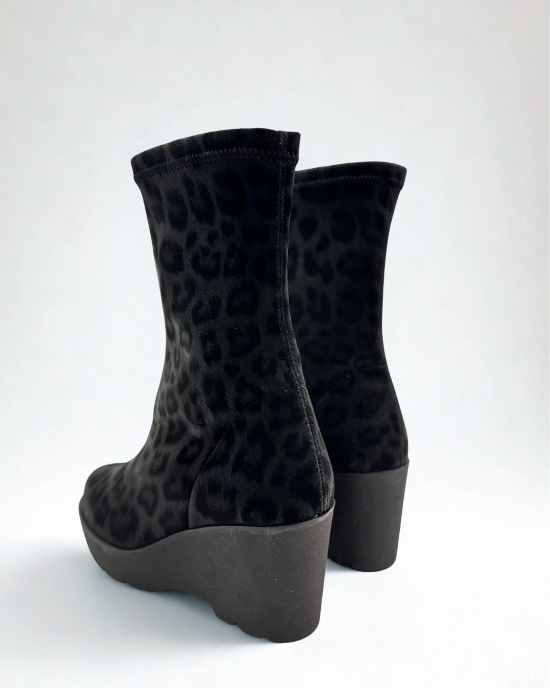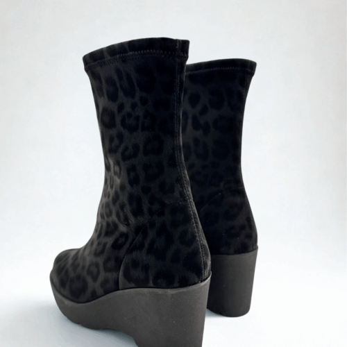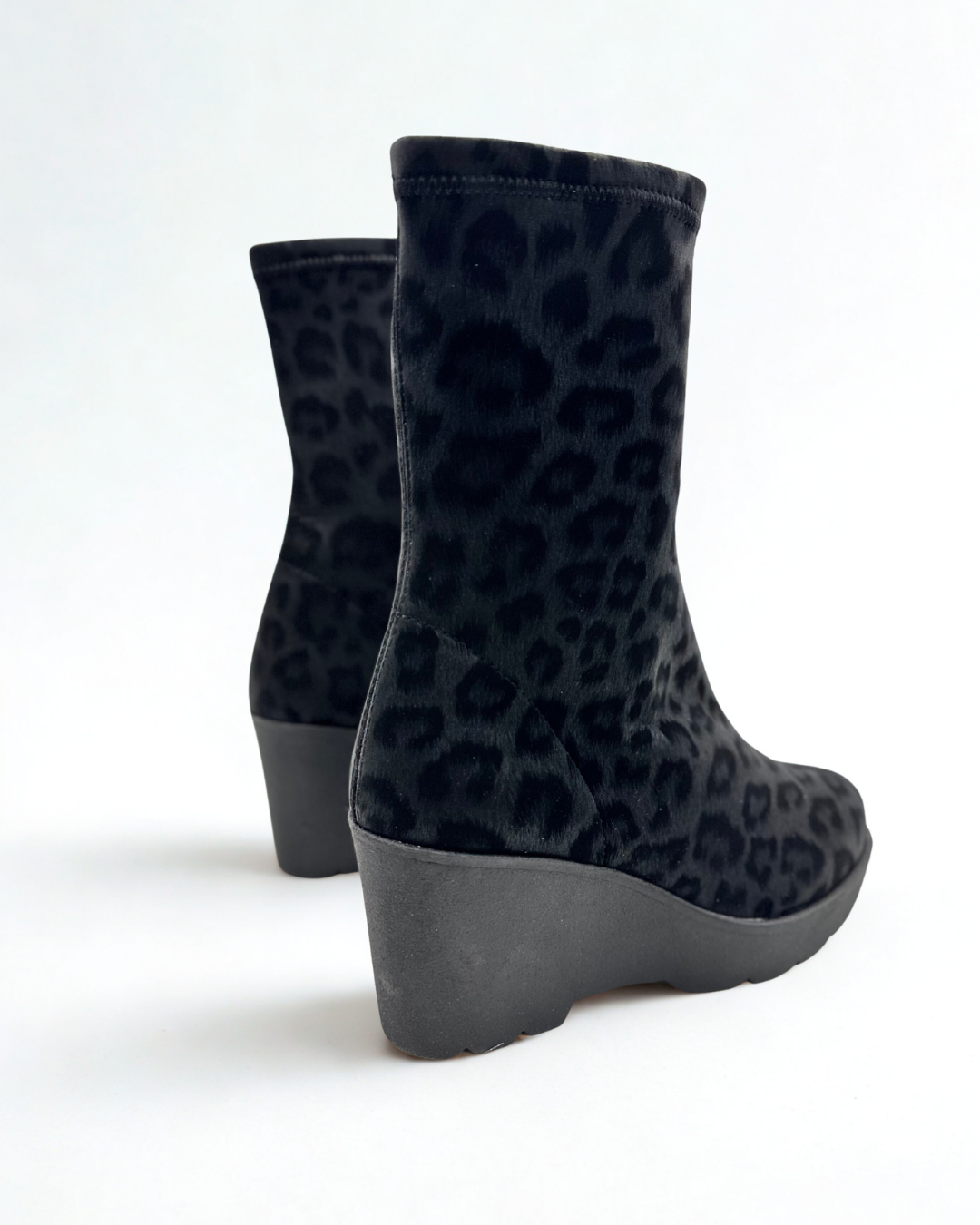 Bota caña baja con tacón de cuña en color negra con dibujo de leopardo.