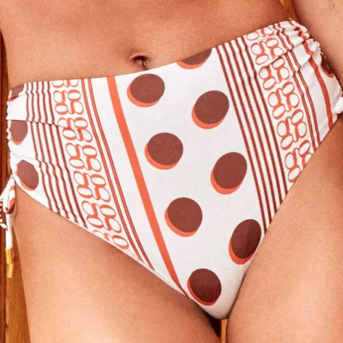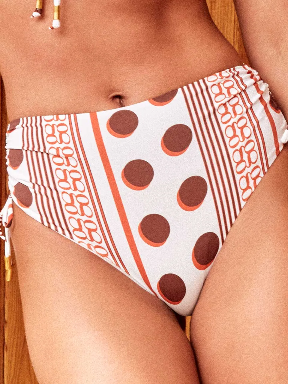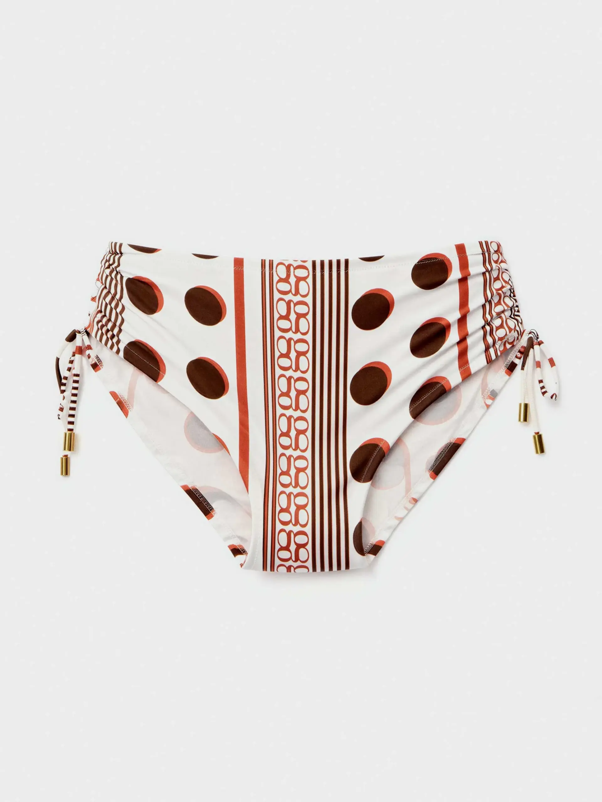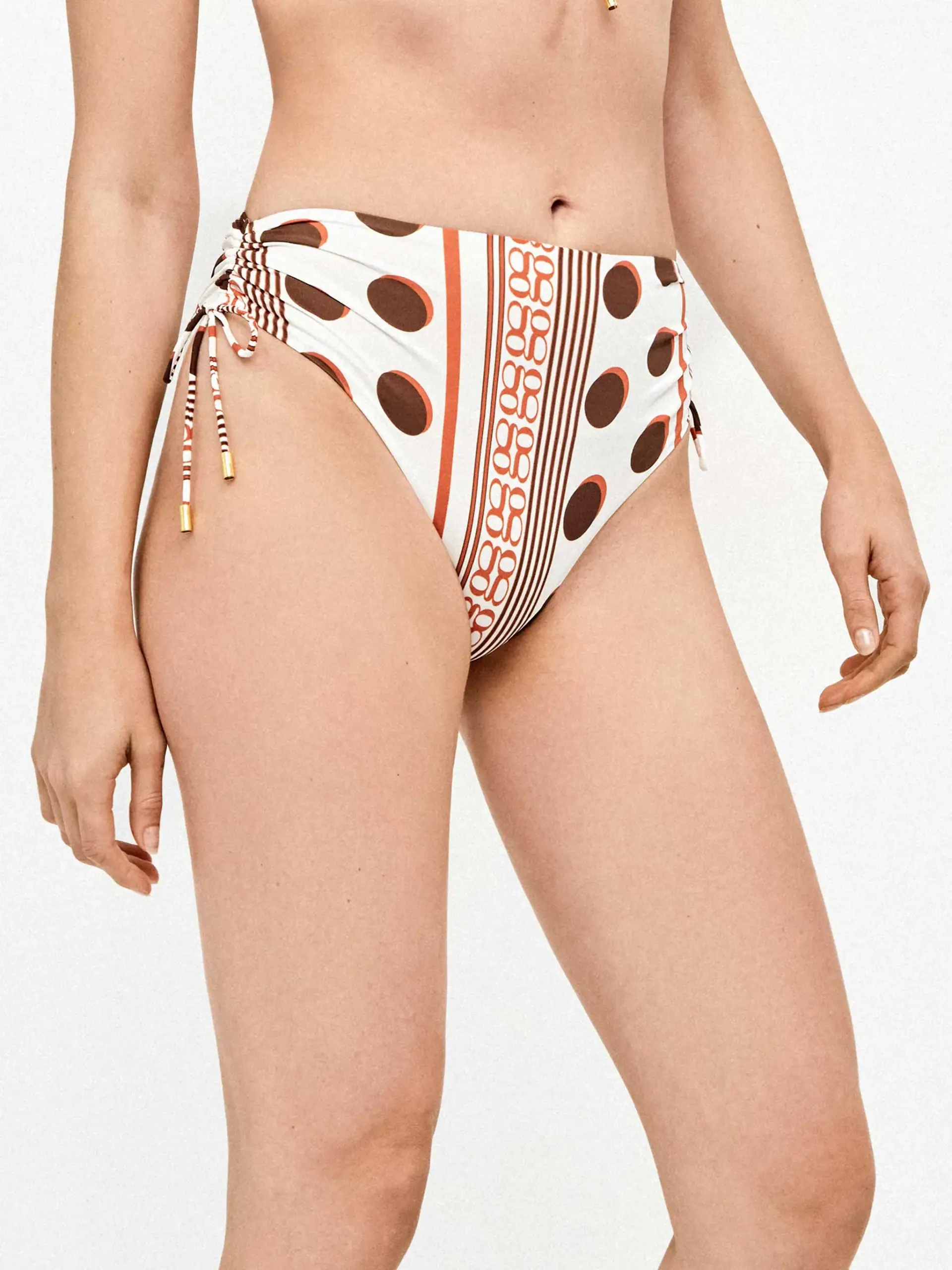 Braguita bikini alta y ajustable en laterales. Estampado monogram que combina lunares, rayas y logo gisela. Combínalo con su braguita bikini a juego.