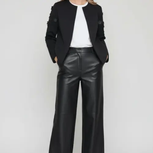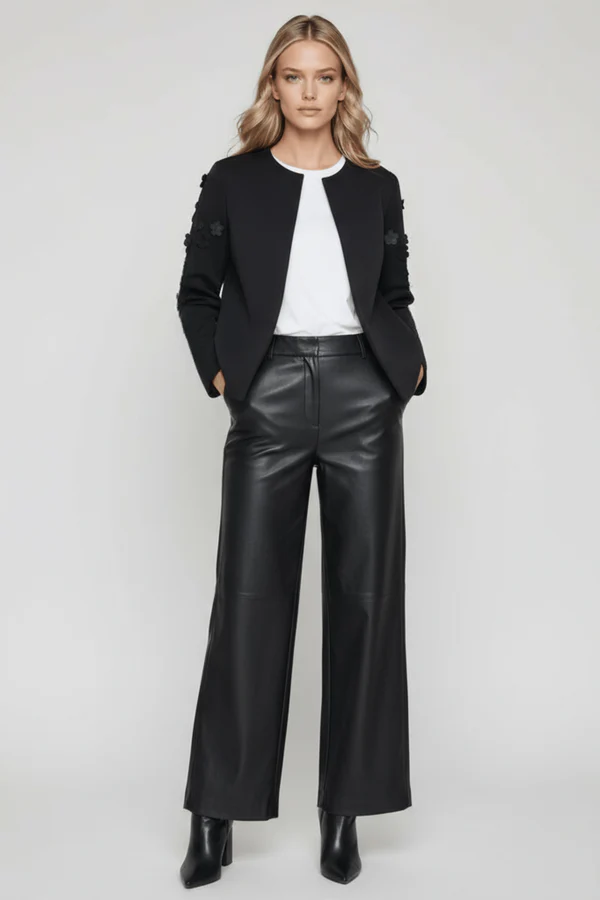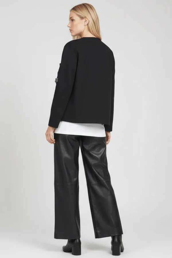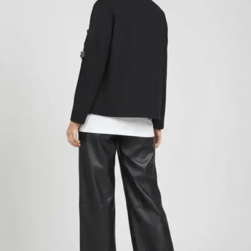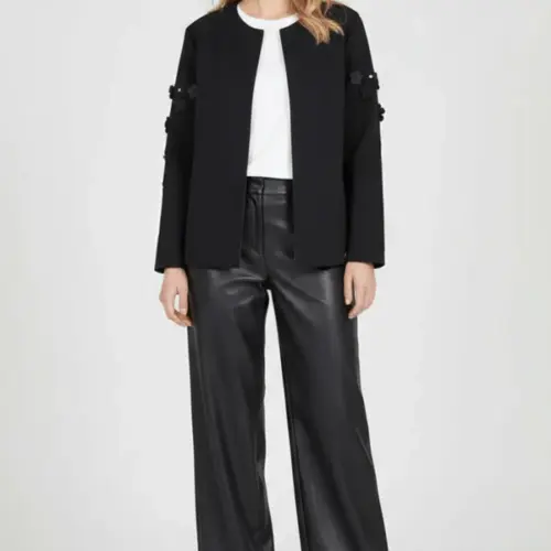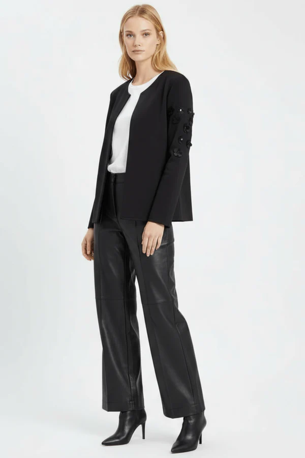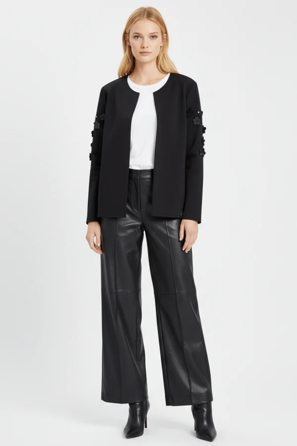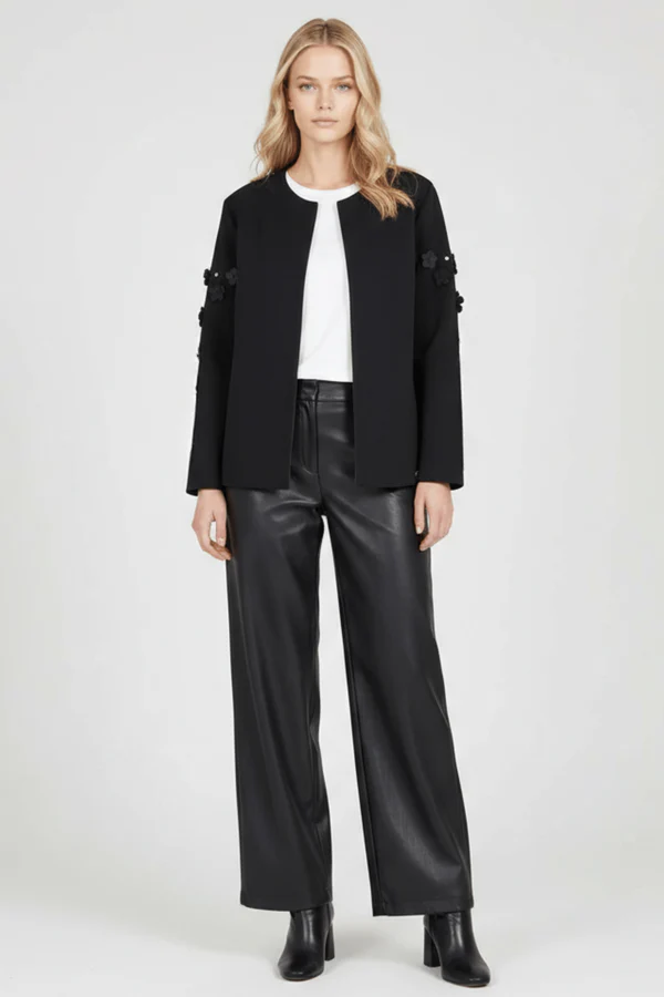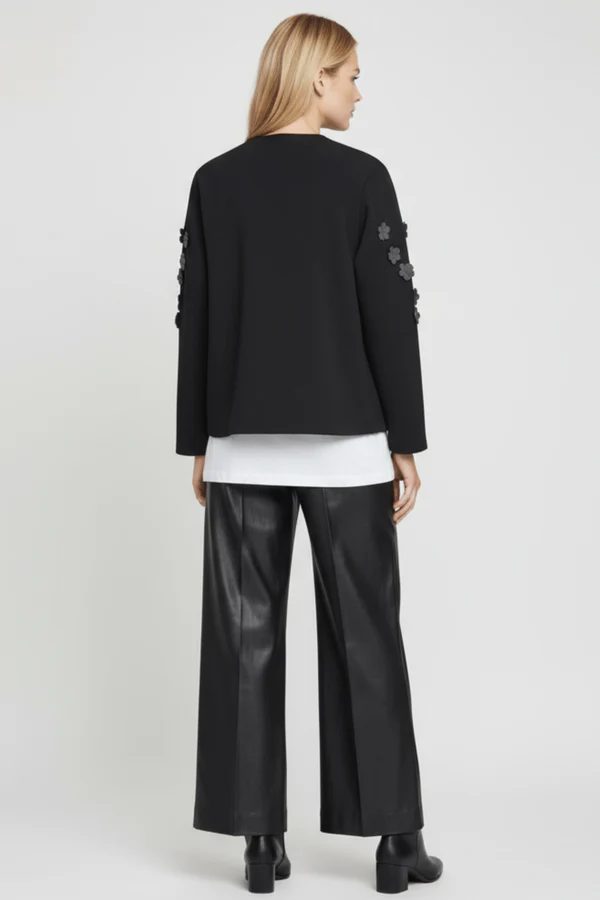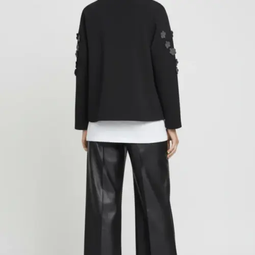 Esta chaqueta negra en neopreno es pura elegancia botánica: aplicaciones en forma de flores con detalles de strass adornan la parte alta de las mangas creando ese efecto statement en los hombros, el cierre con broche en el centro del escote añade sofisticación old-school, y la manga larga completa este conjunto que fusiona naturaleza con glamour, estructura con feminidad. Es el negro que florece, es neopreno con alma de jardín.