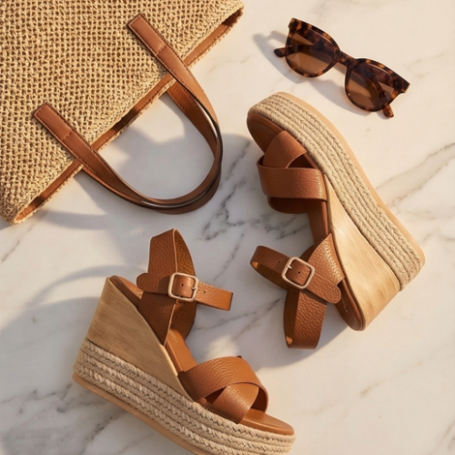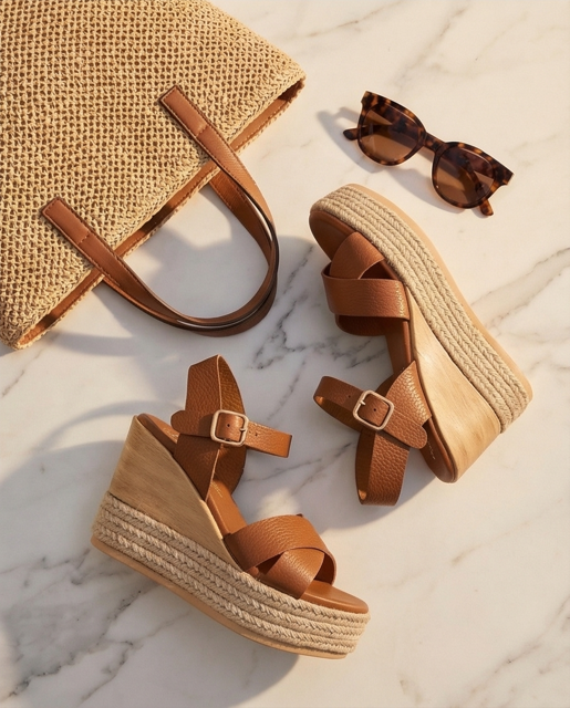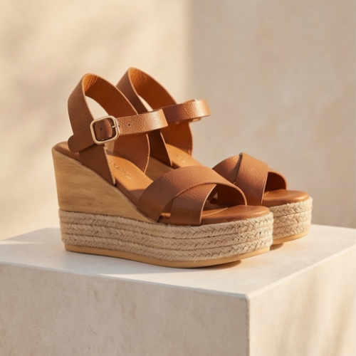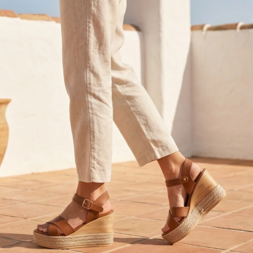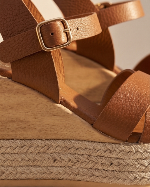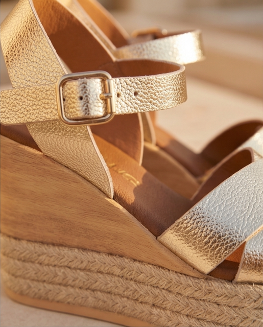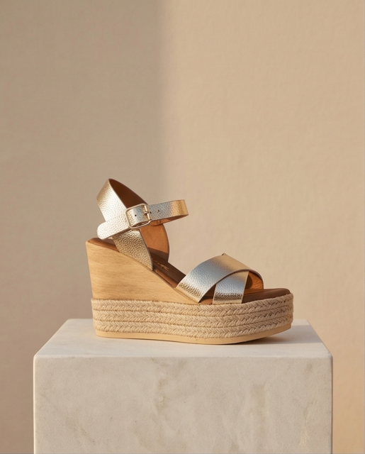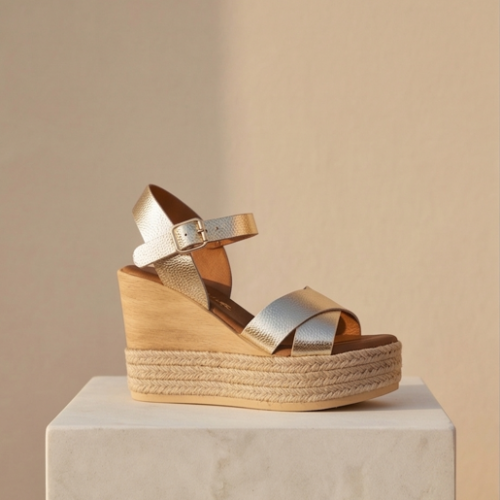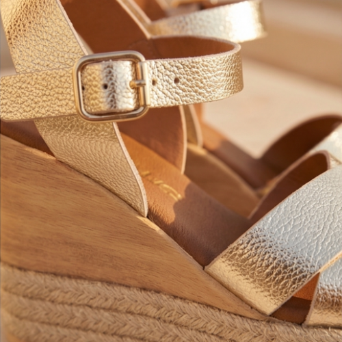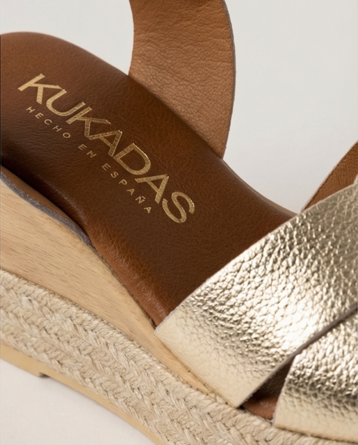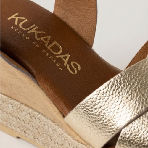 Cuña alta de la marca KUKADAS en color oro y en camel de piel y hechas en España.