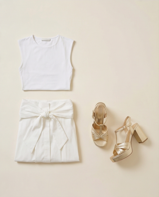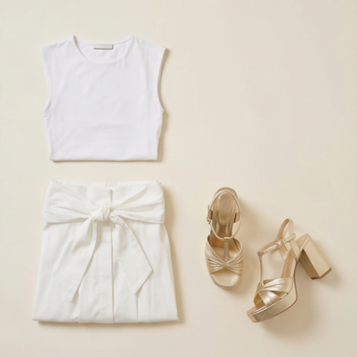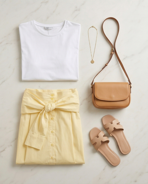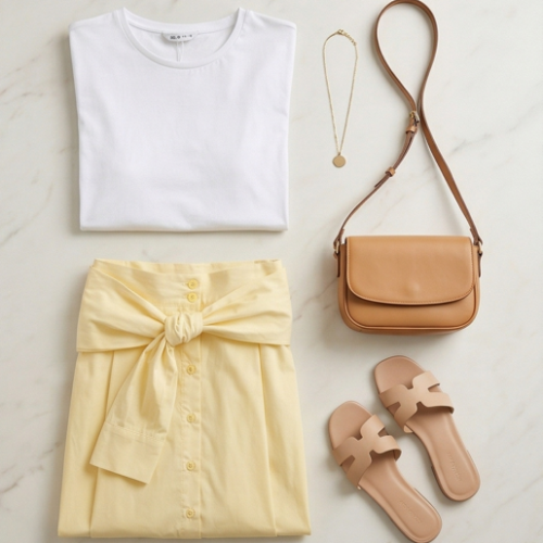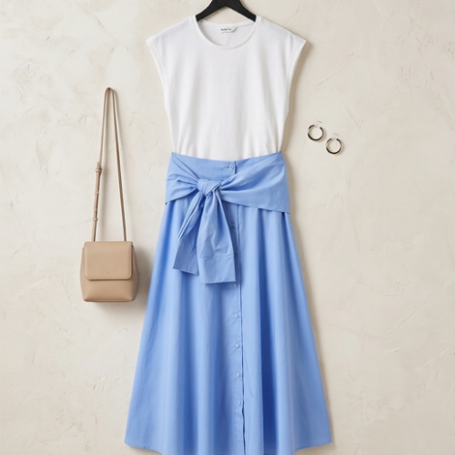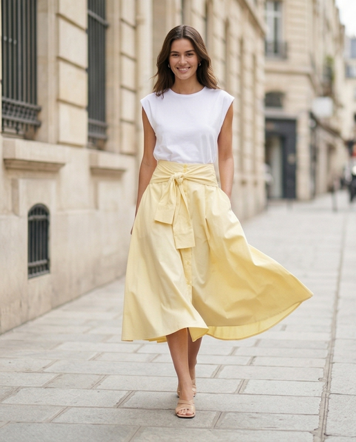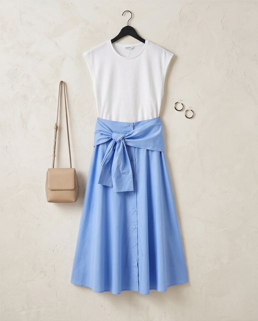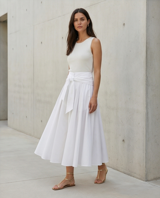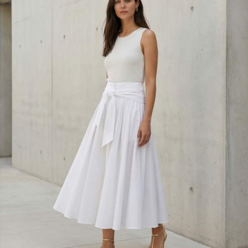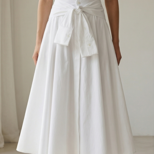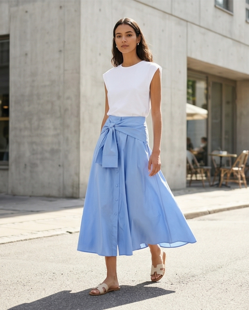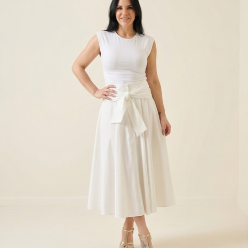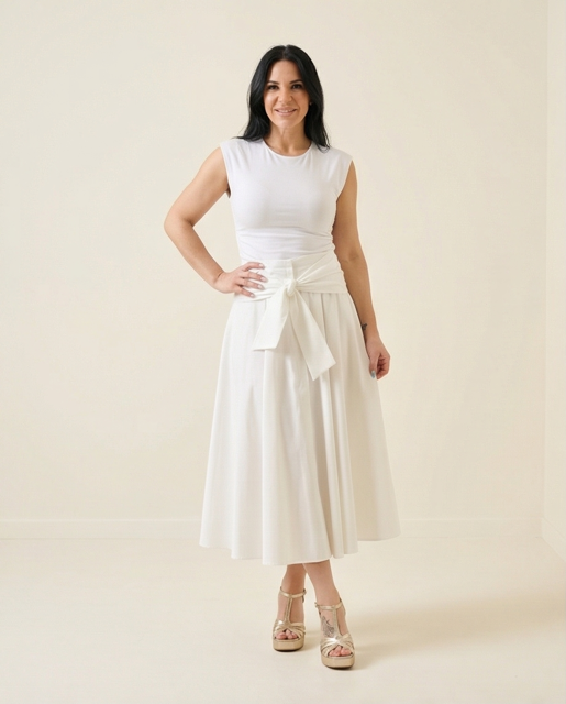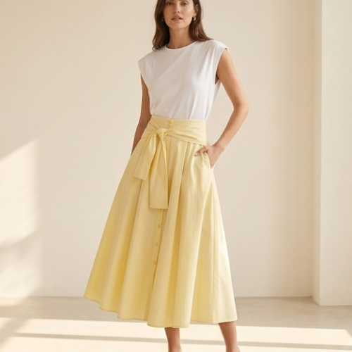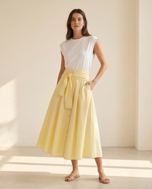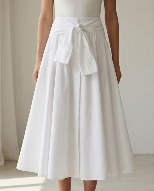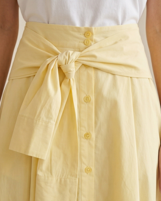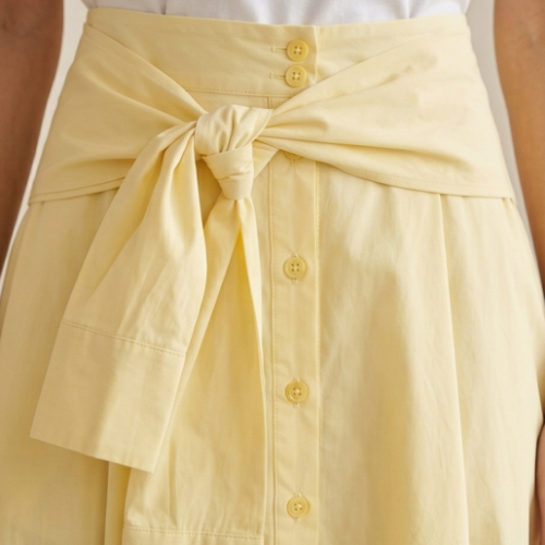 Falda midi abotonada con vuelo, en la cintura lleva una moña que parece las mangas de una camisa
