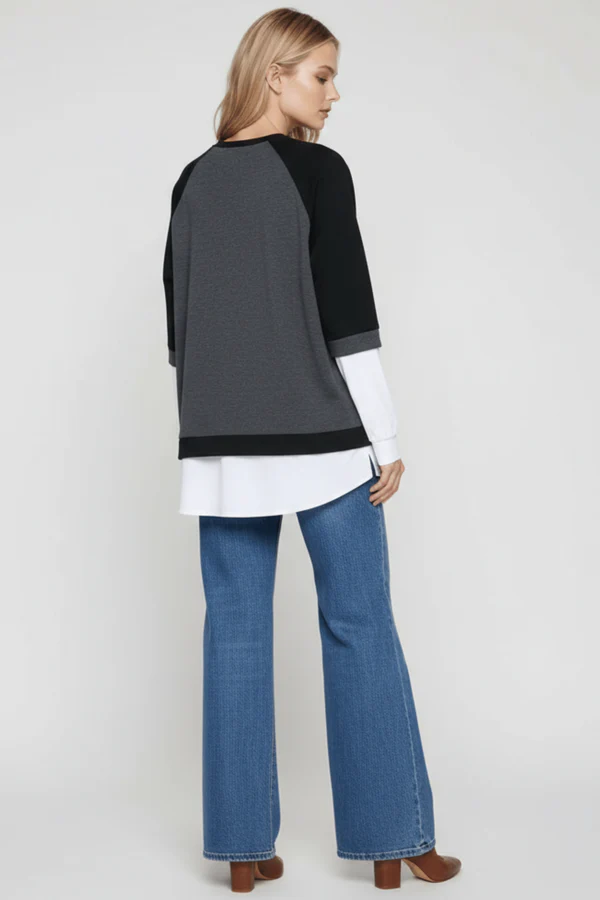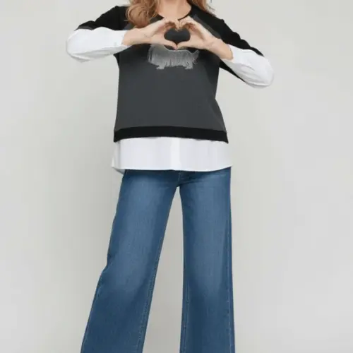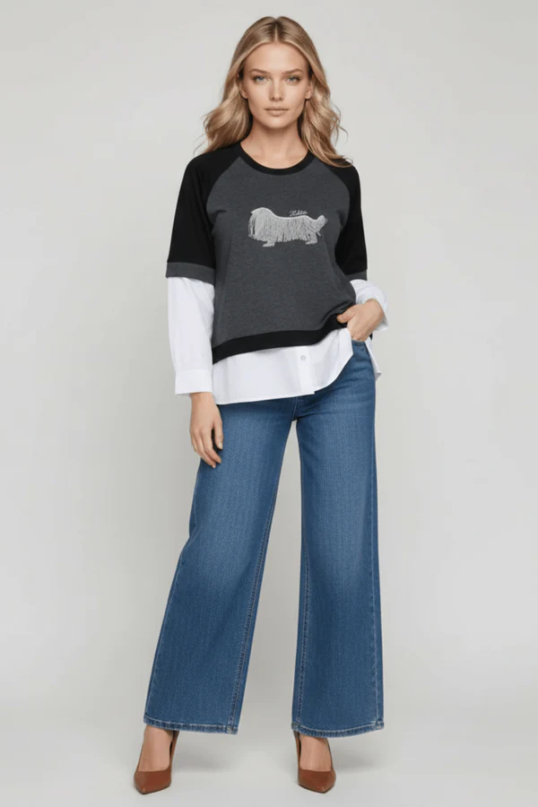 Esta camiseta de algodón cardado de invierno en gris antracita es pura genialidad textil: un perrito de pelo largo bordado te mira con ternura desde el delantero, mientras las mangas raglan se transforman desde el codo en popelín blanco camisero con tapeta y botón. Y la magia continúa: un faldón de popelín blanco en el contorno inferior simula una camisa interior con botones reales. Es el efecto layering definitivo sin el volumen. Es tres prendas en una. Es diseño que desafía las reglas.