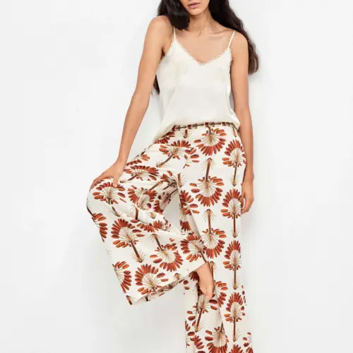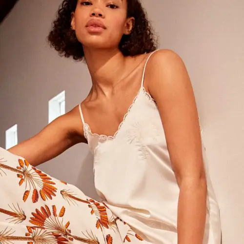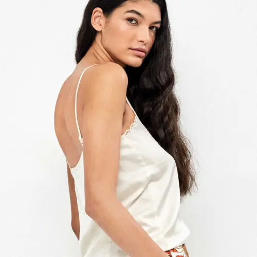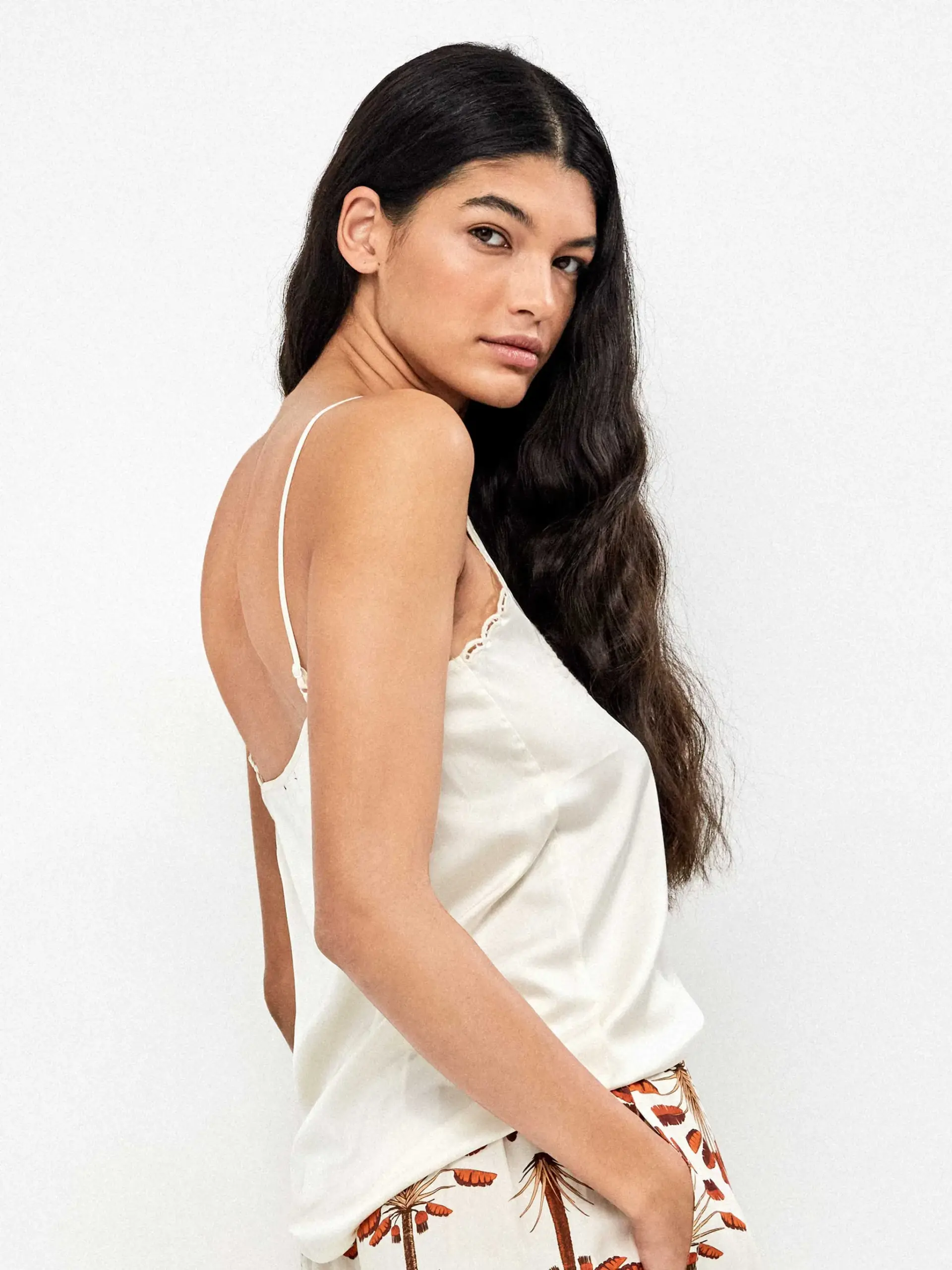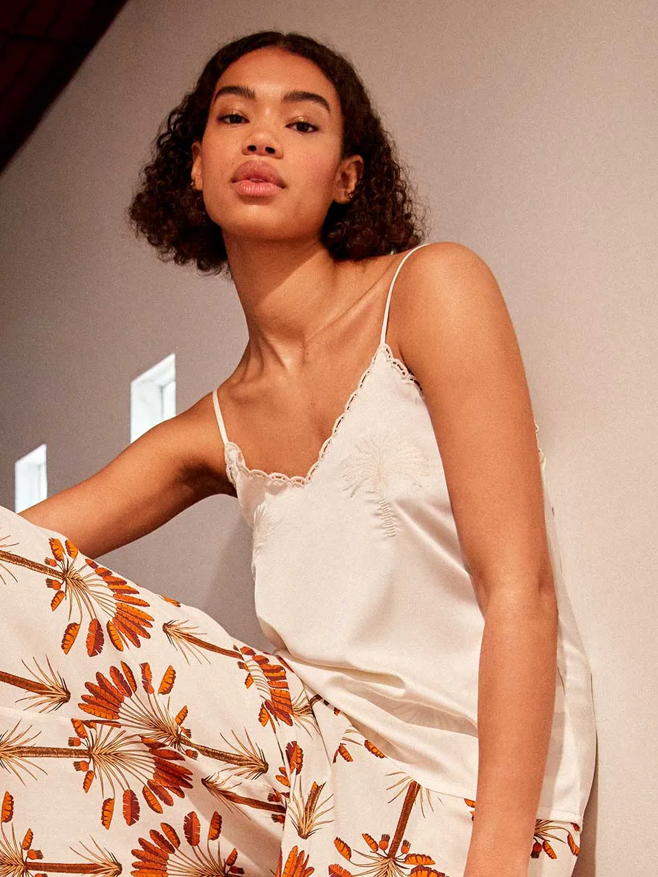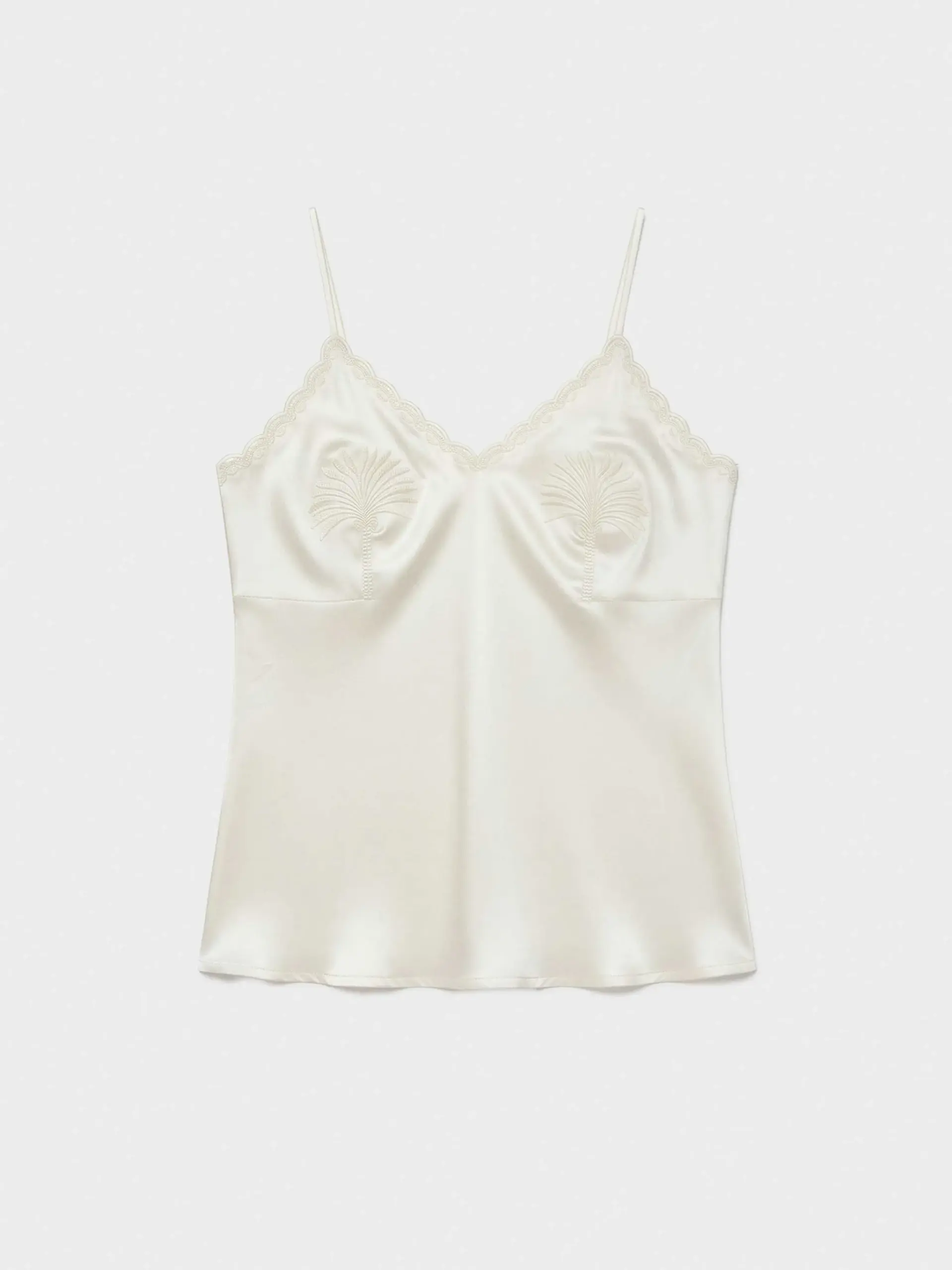 Camiseta en tejido satén colección bridal con tirantes finos y regulables. Detalle de palmeras bordadas posicionadas en el pecho. Detalle bordado en terminaciones del pecho y sisa. Caída fluida y con movimiento. Combínalo con sus pantalones a juego.