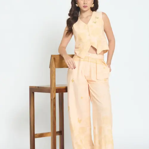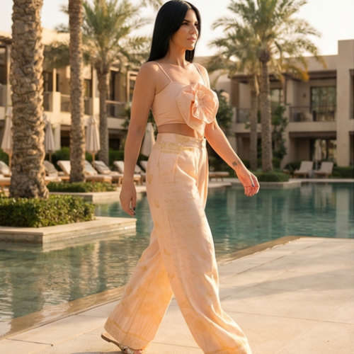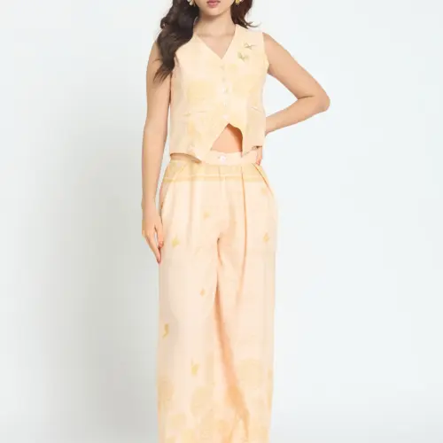 Realza tu vestuario vacacional con estos preciosos pantalones Bloom Butterfly. Confeccionados en un suave color arena-beige con delicados estampados florales en tonos similares y detalles de escritura originales, son la combinación perfecta de elegancia relajada. Su silueta de talle alto y pierna ancha fluye con gracia, mientras que su tejido ligero te mantiene fresca y cómoda. Ya sea que estés descansando junto a la piscina o explorando destinos soleados, estos pantalones te brindan un estilo desenfadado con un toque de encanto botÔnico.