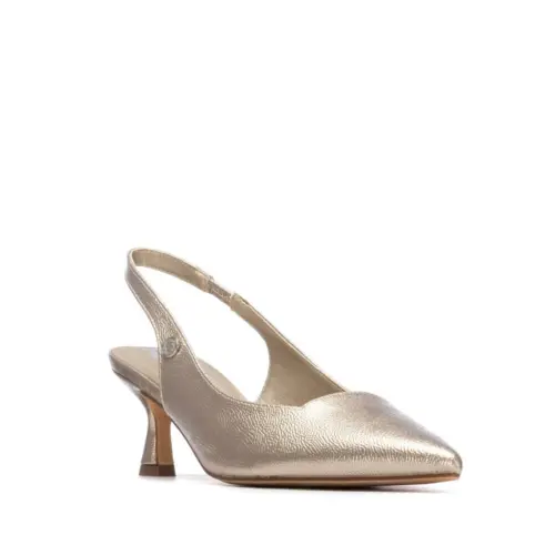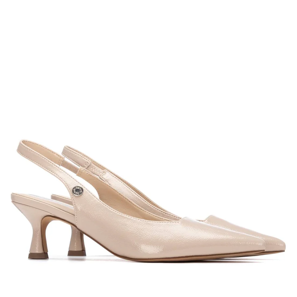Zapato destalonado marca Refresh. Fabricado en material que imita a la piel con acabado charol. Punta afilada y tacón medio tipo kitten. Su diseño elegante y estilizado aporta un toque sofisticado a cualquier look, ideal para eventos formales, oficina o salidas especiales. La correa trasera abierta brinda frescura y comodidad sin sacrificar el estilo. Este modelo ha obtenido el certificado vegano por la organización mundial PETA (Organización de los derechos de los animales).