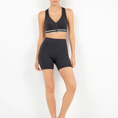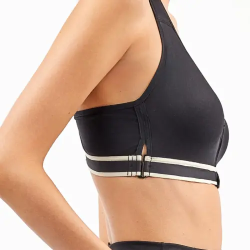 Top deportivo de alta sujeción con cierre delantero y copas preformadas lo que confiere un relieve en la parte baja que hace la forma del aro para dar forma al pecho.. Toda la pieza lleva detalle de líneas en color crema en la zona de las gomas que aporta un plus de diseño a la prenda. Ideal para los ejercicios más intensos y extremos como levantamiento de peso, escalada o salto y como se trata de un top de alta sujeción, además, de para esos momentos deportivos, lo recomendamos para mujeres con mayor pecho.