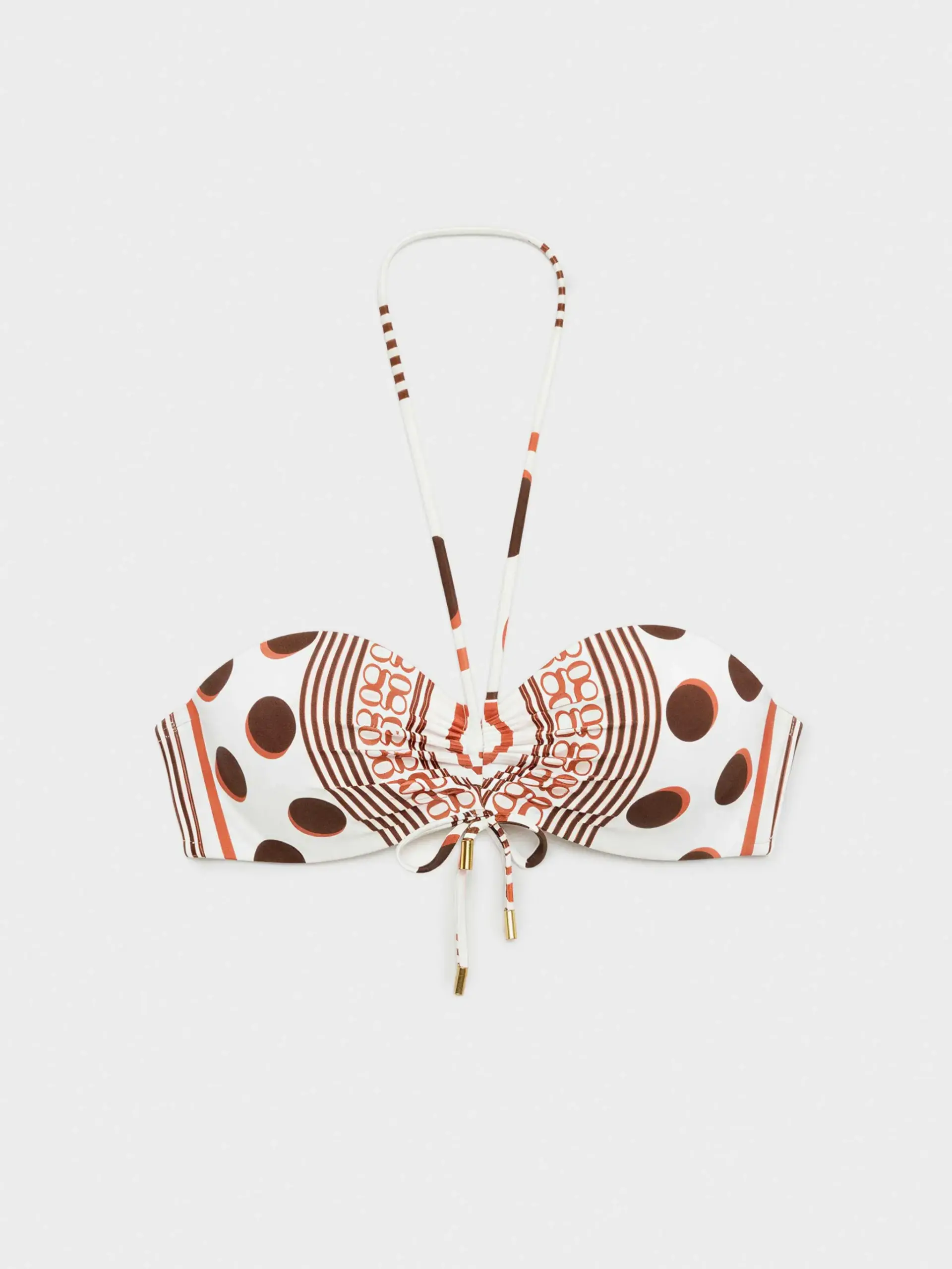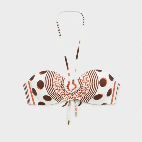 Top bikini bandeau con aro y foam. Tirantes multiposición. Estampado monogram que combina lunares, rayas y logo gisela. Combínalo con su braguita bikini a juego