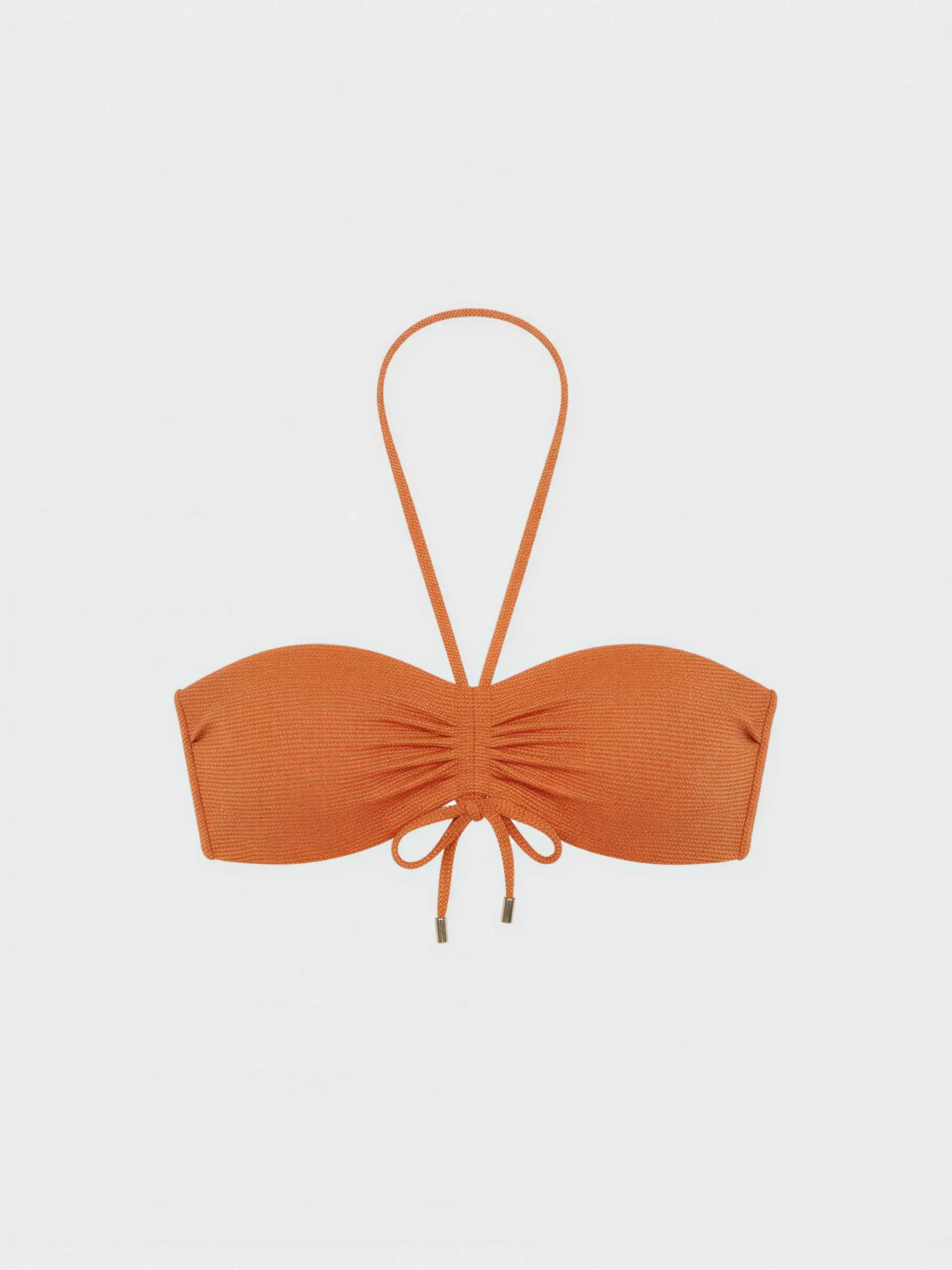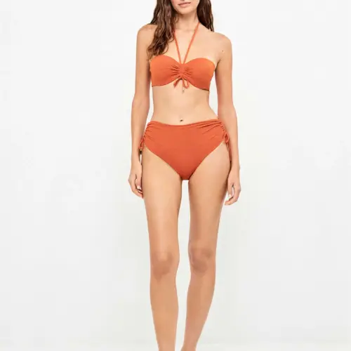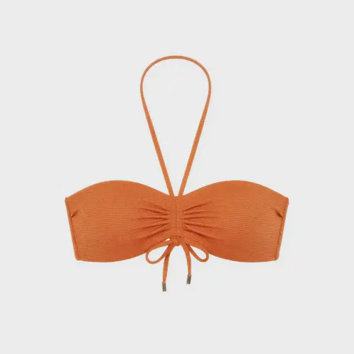 Top bikini bandeau desmontable, tirantes multiposición. Tejido piqué lurex dorado, con cierre especial. Combínalo con su braguita bikini a juego