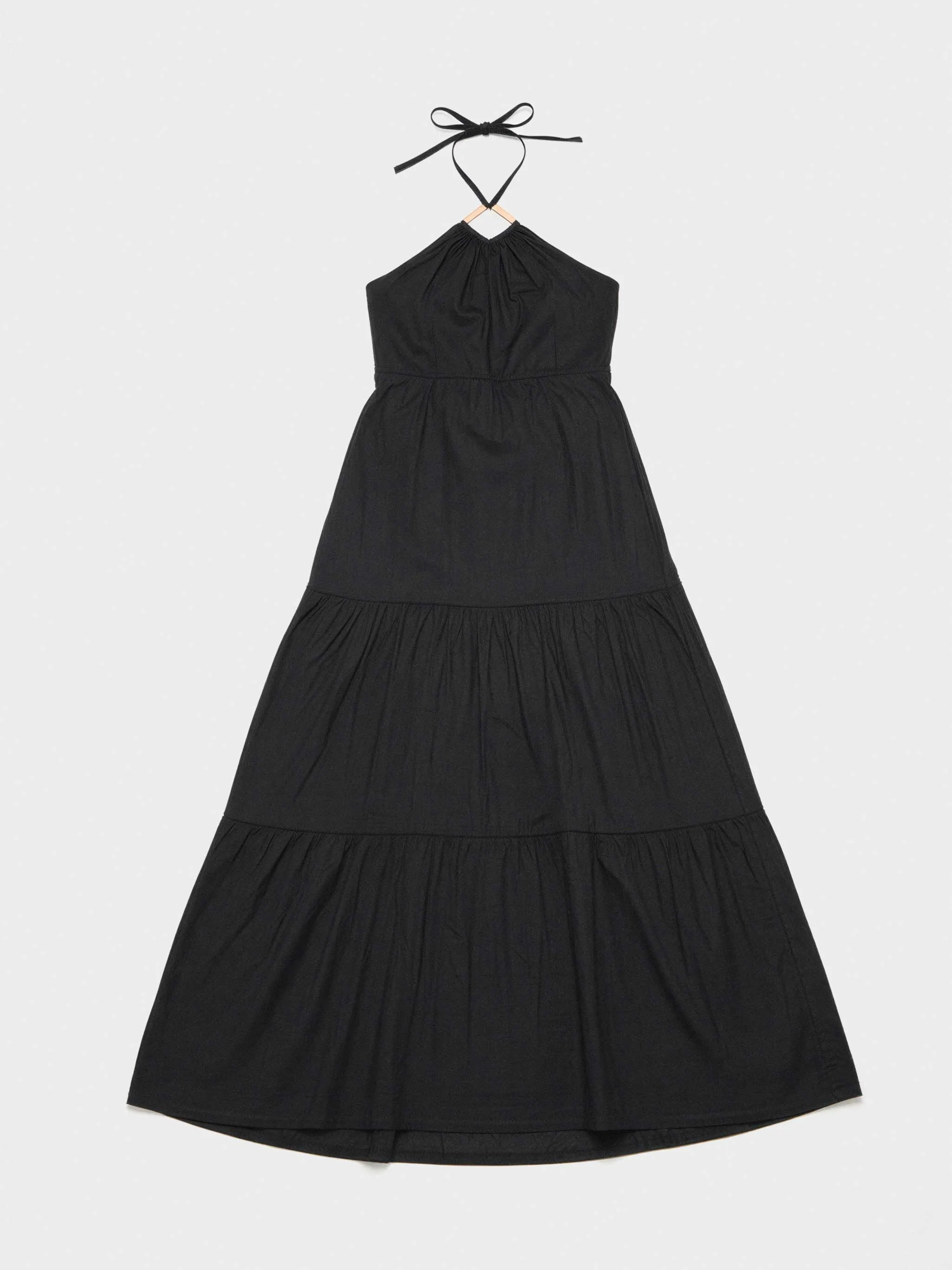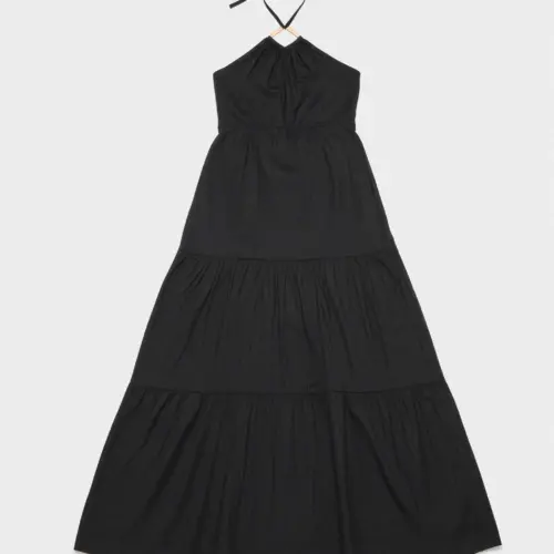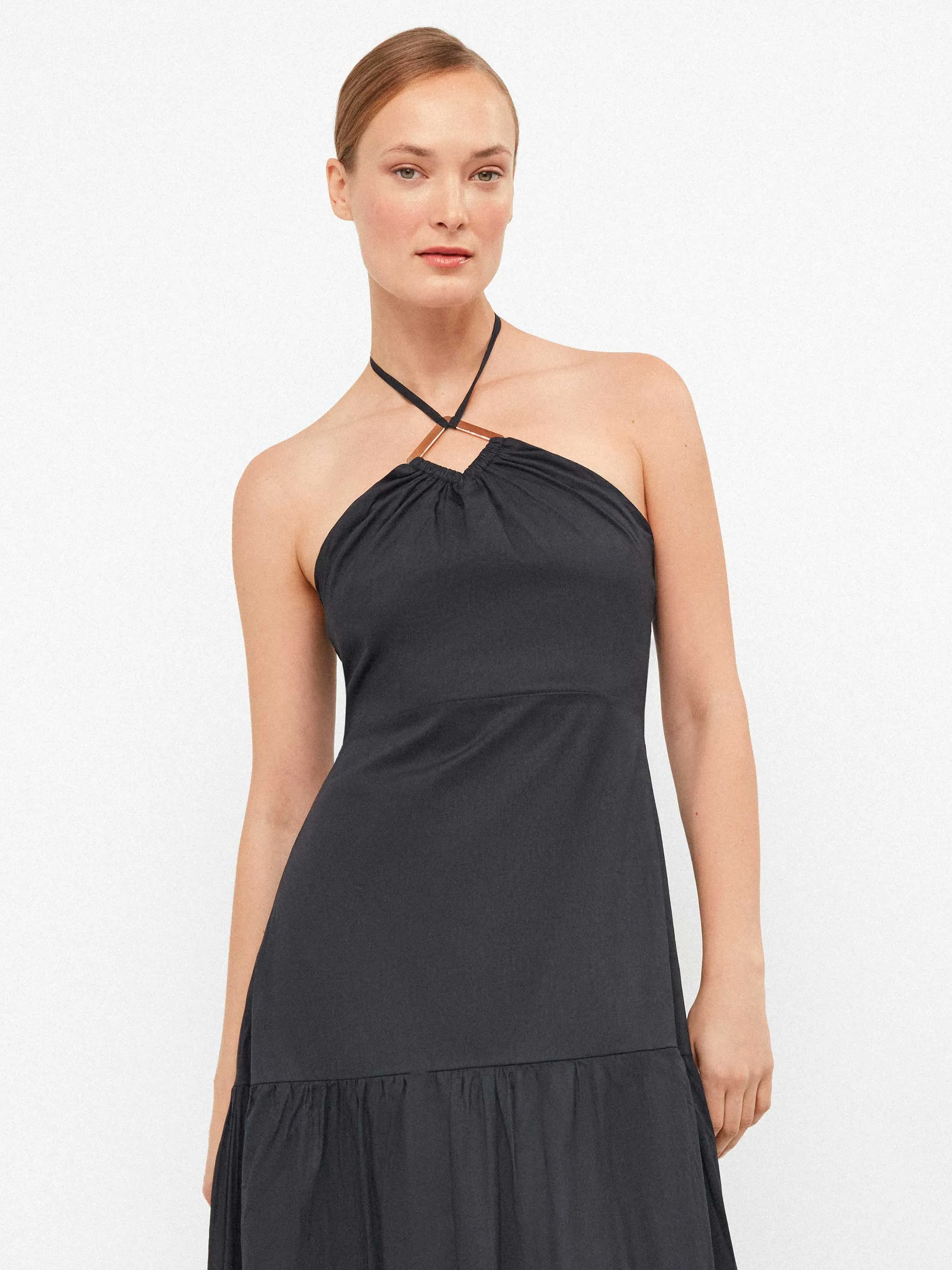 Vestido largo, de corte halter con tirantes que se anudan al cuello. Cuerpo ajustado hasta la cintura y espalda fruncida. La falda de volumen, con dos franjas que le aportan movimiento y aire romántico. Detalle de pieza dorada en el escote. Tejido 100% algodón para mayor confort.